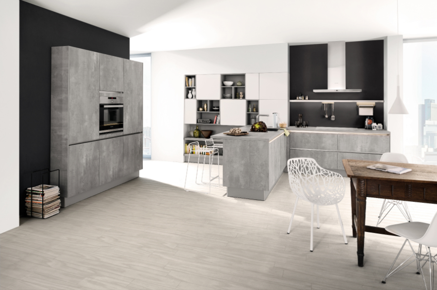 Modern und urban tritt die Front „Comet“ in Spachtelbeton-Optik auf. Mit „Perlgrau“ (Foto) und „Opalgrau“ gibt es zwei Töne zur Auswahl.