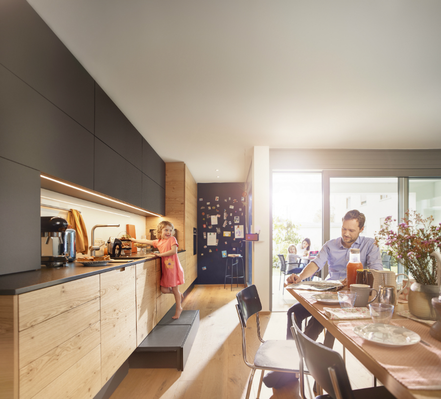 Mit „Space Step“ bringt Blum zusätzlichen Nutzen in den Möbelsockel. Der Auszug dient als Trittfläche und schafft darüber hinaus wertvollen Stauraum. Dass auch die Gestaltungsqualität hoch ist, beweist die Auszeichnung für hohe Designqualität. „Space Step“ wurde mit dem „Red Dot Award 2020“ ausgezeichnet.