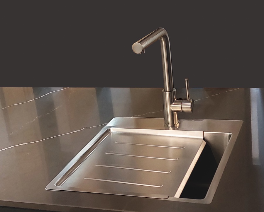 Die passgenau gefertigte Abtropffläche lässt sich bei Nichtgebrauch platzsparend direkt auf dem Becken ablegen. Beim Spülen wird sie einfach seitlich angelegt und funktioniert wie eine klassische Abtropffläche mit leichter Neigung, damit Wasser zurück ins Becken fließt. Das System ist nicht nur in Edelstahl erhältlich, sondern in allen PVD-Farben der Caressi-Oberflächen. So fügt sich die flexible Ergänzung harmonisch in verschiedene Küchenstile ein und bietet Planern wie Endkunden ein praxisgerechtes Argument für die moderne Einbecken-Spüle.