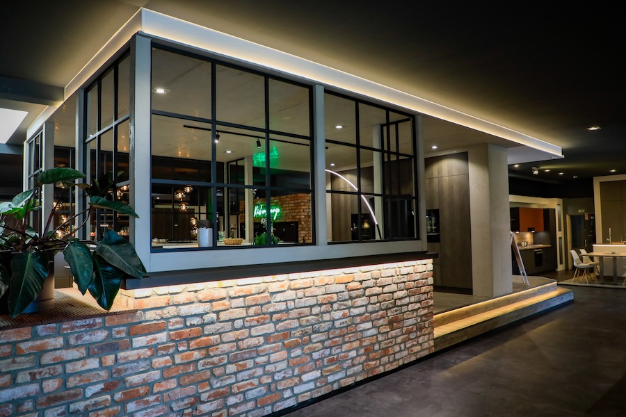 Doch warum gerade Wagenfeld? Nicht, dass es hier nicht schön ist. Doch beide wohnen mit ihren jeweiligen Familien an unterschiedlichen Orten rund 20 Kilometer entfernt und der infrage kommende Kundenkreis für ein weiteres Küchenstudio ist überschaubar. „Weil es dort eine bezahlbare Immobilie gab“, sagt Markus Schlottmann trocken. Kein Palast, räumt er ein, eher ein in die Jahre gekommener Sonderpostenmarkt. Aber verkehrsgünstig gelegen, passend groß und eben günstig. So wurde nicht lange gefackelt. Alte Sofas und anderes Mobiliar landeten auf dem Sperrmüll und das komplette Gebäude wurde auf links gedreht. Kernsanierung. Von den 1.300 Quadratmetern Gesamtfläche werden 700 für die Ausstellung genutzt, je 300 für Lager und Büros.