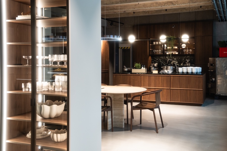 In den Räumen einer ehemaligen Möbelschreinerei entstand ein Loft mit industriellem Charakter, offenem Lichteinfall und handwerklichen Details. Neben Ausstellungsküchen gibt es Flächen für Kochkurse, Planungsworkshops und Veranstaltungen.