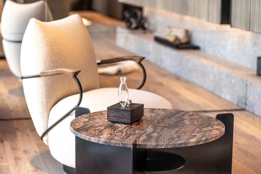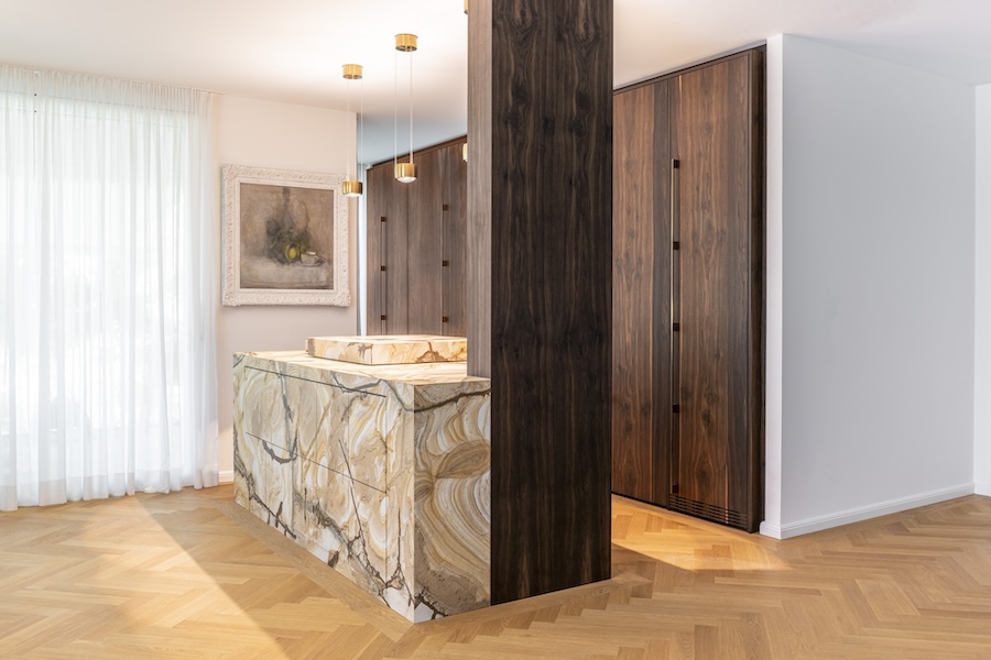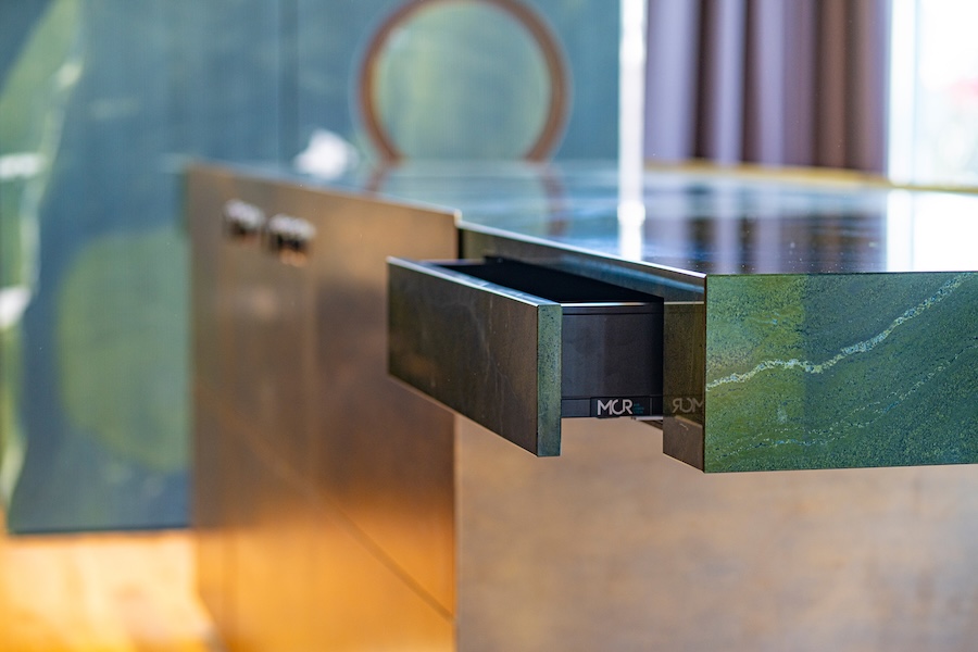 Die Benchmark, das ist für MCR eine beeindruckend präzise Linienführung, die selbst vermeintlich unmögliche Projekte maßstabsgetreu in Stein meißelt. Das gipfelt schon mal in Details wie einen neuartigen Kleber, der die Farbe des Natursteins aufgreift und entlang der Gehrungskante von Gelb zu transparent zu Rot changiert. Bei so viel Perfektionismus bekomme er einfach Gänsehaut, sagt Inhaber Steffen Würstl. Überhaupt sei der Erlebnischarakter das Thema der Stunde im Küchenraum: Kaum noch werde ein Stein poliert verkauft; viele Käuferinnen und Käufer entschieden sich stattdessen für gelederte Oberflächen mit naturnaher Haptik. Oder sogar für die sogenannte „Crosta“-Kante, die von einem abrasiven Sandstrahl mit mehrfacher Schallgeschwindigkeit bearbeitet wird und anschließend wie frisch vom Fels geschlagen anmutet.