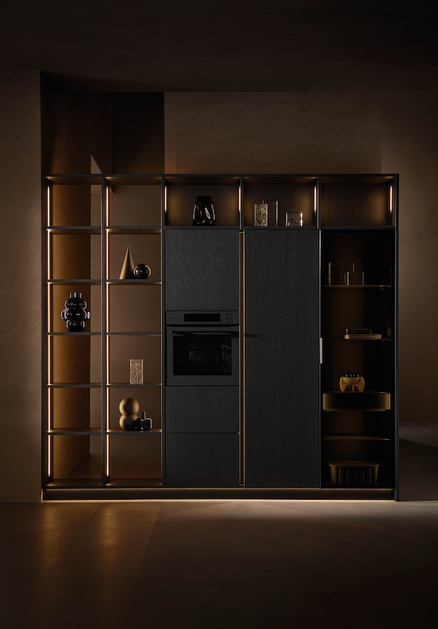 Funktionaler geht es mit der zweiten Errungenschaft zu, die next125 in Zusammenarbeit mit dem Beschläge- und Lichtspezialisten Häfele in Mailand präsentiert: „LumiQ“ heißt das ganzheitliche Lichtsystem, das nicht nur bis ins Detail durchdacht ist, sondern die Küche auch bis in den letzten Winkel ausleuchten soll. Das Zusammenspiel aus Sockel-, Griffmulden-, Schrank- und Nischenbeleuchtung lässt sich via App oder Fernbedienung steuern und in verschiedenen Lichtszenarien bündeln. Eine digitale LED-Leiste entlang der Küchenzeile kann erstmals Lichtbewegung imitieren. Was technisch komplex klingt, wird bei „LumiQ“ mit einem Stecksystem und vormontierten Komponenten so weit vereinfacht, dass Planung und Montage schnell und unkompliziert erfolgen. Das soll künftig die Hemmschwelle im Fachhandel senken, die Beleuchtung der Küche im Beratungsgespräch mitanzugehen. Bestenfalls, so erhofft es sich Schüller, erhöht das nicht nur die (emotionale) Abverkaufsrate. Sondern auch den Warenkorb.