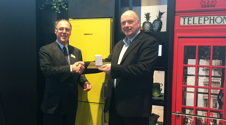 Wolfgang Pauler (Testchef von CHIP, rechts im Bild) überreicht den Preis für den Hersteller des Jahres in der Kategorie "Kühlschränke" an Günther Sproll, Marketingleiter von Liebherr. Foto: Liebherr.