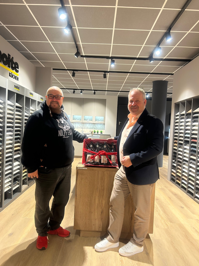 Küchen Areal Regionalleiter Hansjürgen Brag gratuliert Inhaber Ralf Bartsch im Namen des Verbands. Foto: Garant