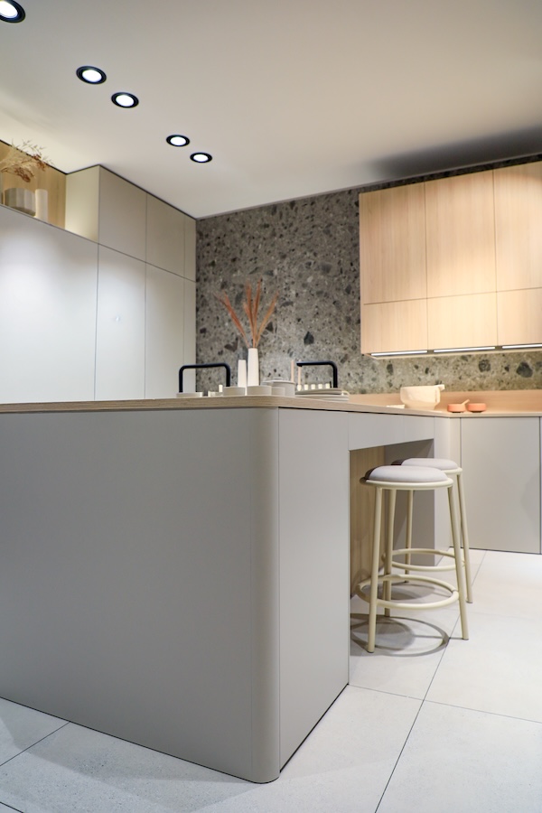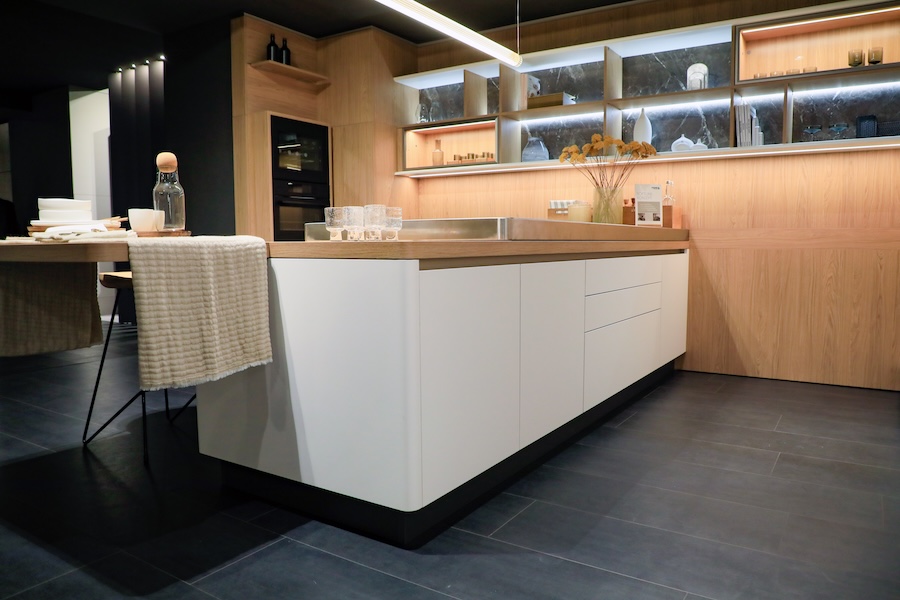 Der Trend zu Sinnlichkeit und Entschleunigung zeigt sich besonders in der Formensprache. Weiche Rundungen nehmen dem Kastenmöbel die Härte, Technik tritt wie eingangs erwähnt in den Hintergrund. Japandi, die Mischung aus japanischem Purismus und skandinavischer Behaglichkeit, prägt viele Entwürfe. Sanfte Linien fördern die Gemütlichkeit und schaffen Harmonie zwischen Küche und Wohnraum. Wobei die Farbwelten die Vermittlerrolle übernehmen. Sand, Taupe, Macchiato, Caramel oder Coffee dominieren die neuen Kollektionen. Warme Naturfarbtöne von Beige bis Sepia erzeugen Ruhe und Tiefe. Grün bleibt Akzentgeber: Salbei, Olive und Avocado vermitteln Frische und Naturnähe, ohne zu dominieren. Dunkle Kontraste wie Midnight oder Fjord bringen zusätzliche Eleganz in moderne Konzepte. Ebenso wie mattes Schwarz, das sich zunehmend von der Möbelfront zurückzieht und sich auf die Geräteoberflächen konzentriert. Holzdekore sind als Kombinationspartner ebenfalls allgegenwärtig, oft mit Synchronpore oder als Echtholzfurnier, um die Anmutung des Echten zu bewahren. Denn der Naturbezug steht hoch im Kurs und wird budgetkonform mit Naturstein, Keramik, Echt- oder Massivholz und massiver metallischer Materialität verkörpert. Ergänzend gewinnen auch in den Nachbildungen feine Stein- und Terrazzo-Optiken an Gewicht. Und Taj Mahal auf der Platte. Einheitlichkeit ist das Stichwort: Korpus, Front und Innenfarbe verschmelzen zu einem ruhigen Gesamtbild. Jegliche Form von Exzentrik fällt auf und wirkt umso strategischer gesetzt.