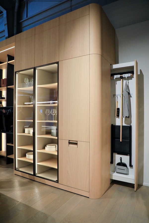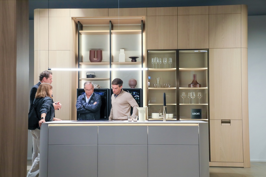 Gleichzeitig steht 2026 für robuste Eleganz. Anti-Fingerprint-Oberflächen sind Standard, ihre Haptik wird immer feiner. Neue Oberflächen verbinden Widerstandsfähigkeit mit samtiger Oberfläche. Auch das Innenleben folgt dieser Logik. Schmale Zargensysteme verfeinern das Design mit dunklen Lackierungen oder Titan-, Glas- und Holzoptiken. Hochschrankwände erhalten Auszugs-Abschlussschränke, Vorratsräume werden begehbar und auf den Arbeitsflächen bewegen sich leichtgängige Auszugstablare aus dem Aufsatzschrank und transportieren alles, was nützlich ist, aber ungenutzt im Weg rumsteht. Wer jetzt an den Thermomix oder eine Heißluftfritteuse denkt, liegt gar nicht so falsch. Bei alledem wird Licht immer mehr zum Stimmungsmacher.
